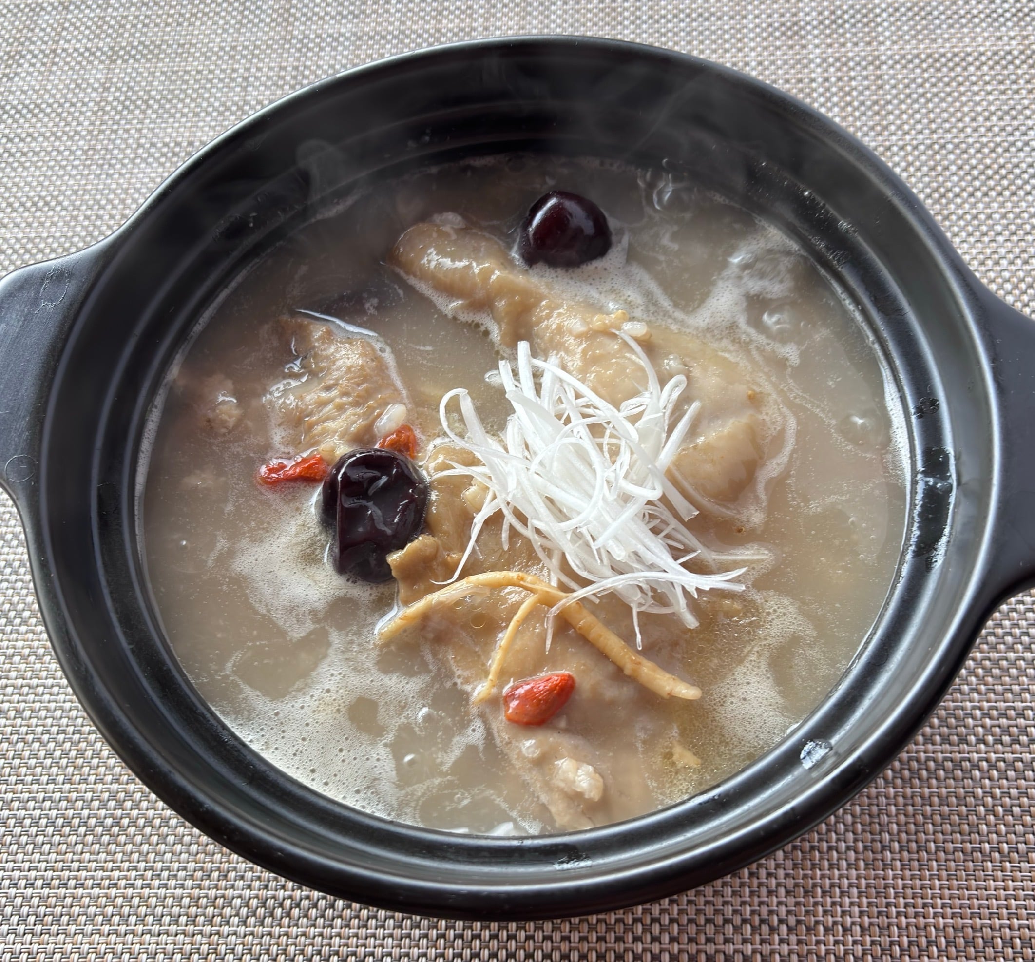 韓国のおなじみ鶏肉を煮込んだスープ。滋養があるので、夏バテや寒い冬にもオススメの料理です。トロミがあって体が温まります。あの高麗人参も少しセットします。