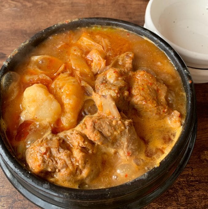 本場は韓国ソウルでも大人気の骨付き豚肉とじゃがいもの鍋料理。セットのえごまパウダーで香りとコクが桁違いです。寒い時期にハフハフしながら食べましょう!